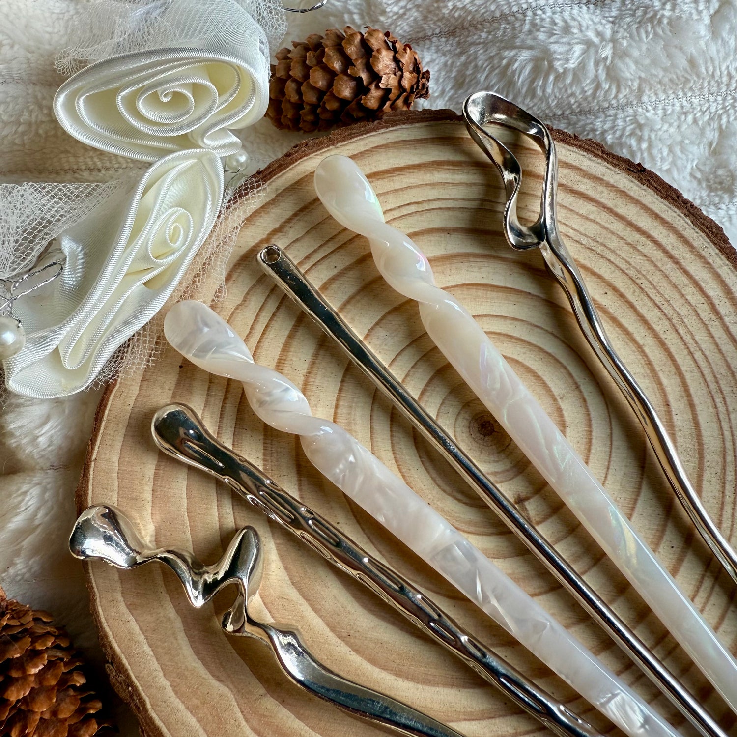 Our metal hairpins are more formal — they have a strong hold, a sleek curved design, and give a vintage, refined look perfect for evenings or special occasions